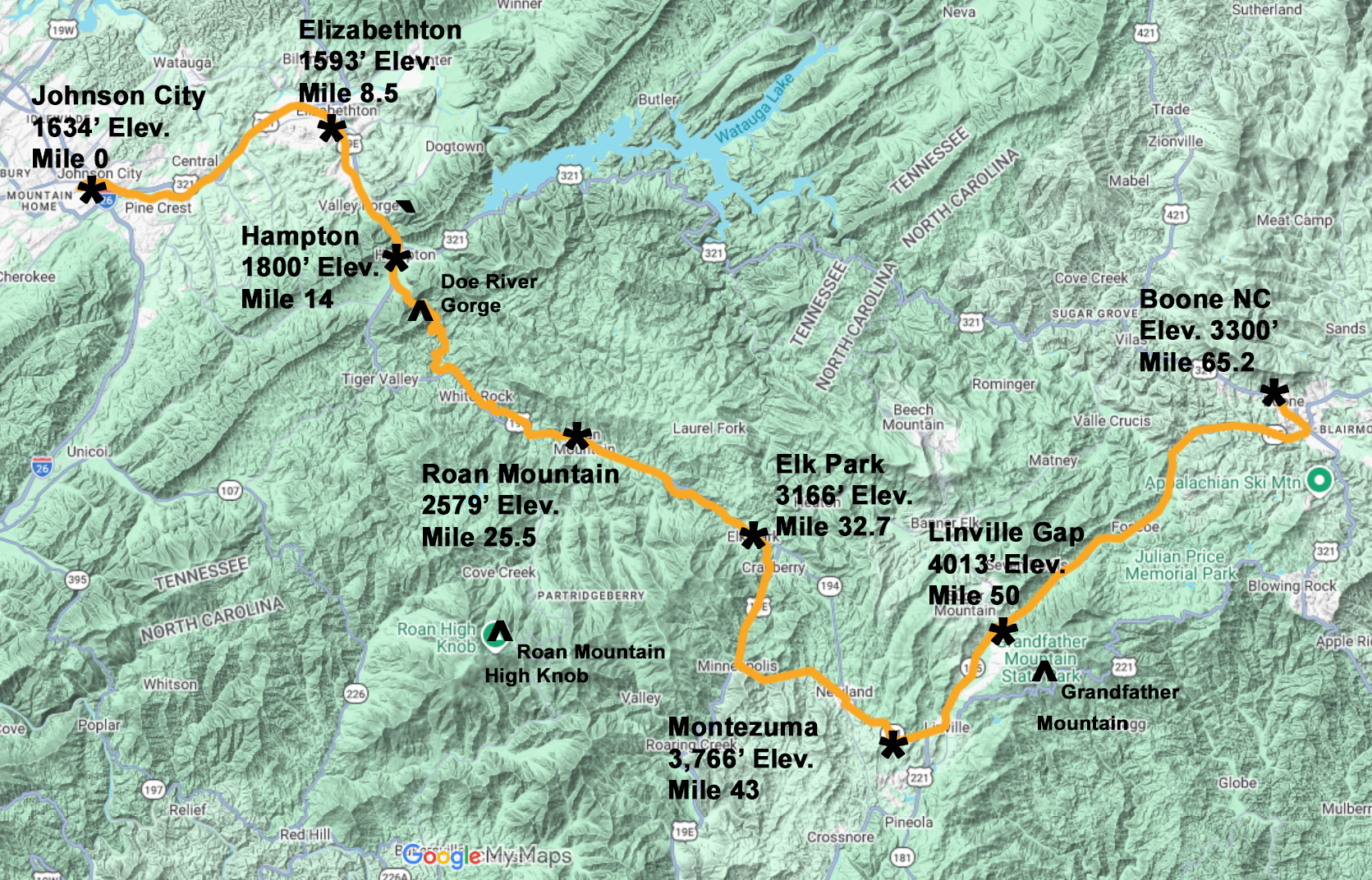 The well-know geographic features along the route were the Doe River Gorge, Roan Mountain, and Grandfather Mountain.
